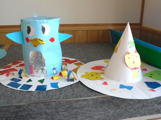 2年生は”ぼうしを かむって”と、紙製の帽子を作りました。