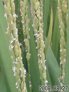 真夏に生長した稲が穂を出し、稲の花を付けている。